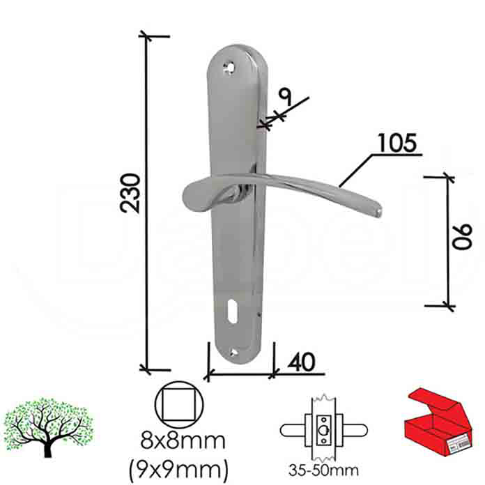 Dimenzije: razmak 90 mm, širina šilda 40 mm, visina 230 mm, debljina 10 mm, dužina ručice 105 mm.