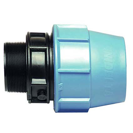 Unidelta poluspojnica 20x1/2" PN16 sa spoljnim navojem namenjena je za povezivanje PE cevi prečnika 20 mm sa elementima koji imaju 1/2" unutrašnji navoj