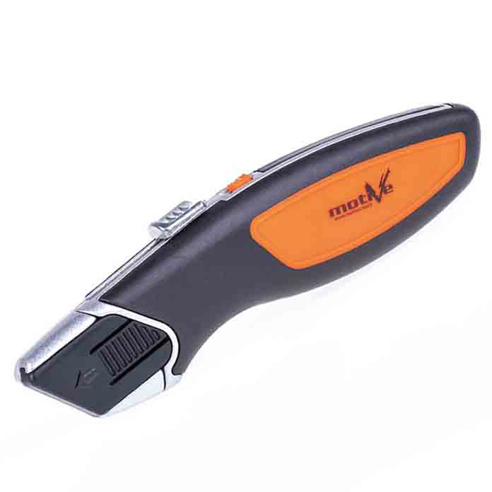 Oštrica se **automatski uvlači** čim izgubi kontakt sa materijalom, čime se sprečavaju povrede i neželjena oštećenja robe. Kućište je izrađeno od izdržljivog dvokomponentnog materijala, sa **gumiranom površinom** koja obezbeđuje siguran hvat i udobnost tokom rada.